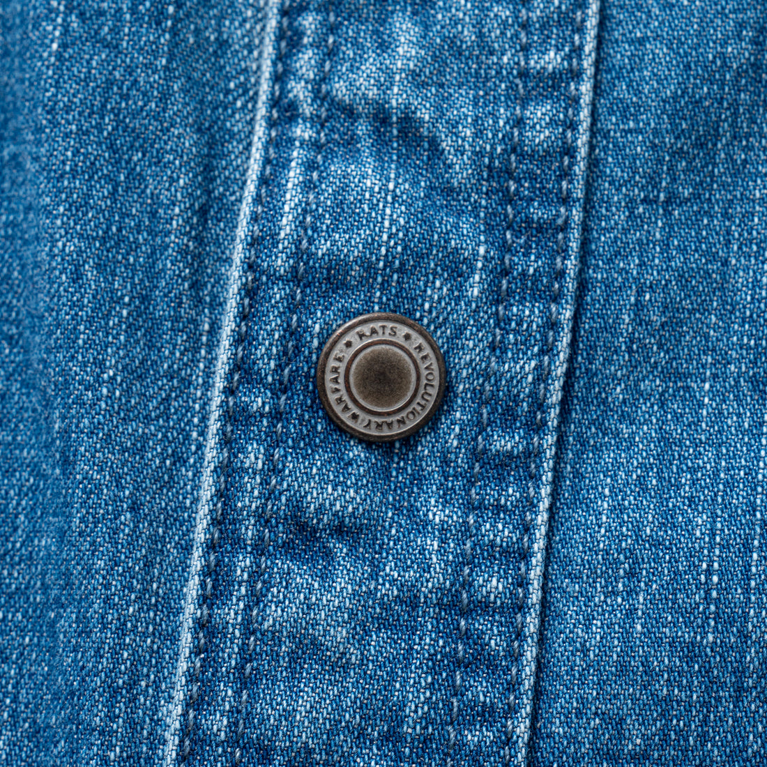 9oz.の広島県産オリジナルデニム生地を使用したデニムワークシャツ。運針数の細かい縫製仕様によりパッカリングやアタリがボディ全体で表現されたデザイン。前立て・袖口のスナップボタンはエイジング加工を施したオリジナル。胸元左右にフラップ付きポケット、左ポケットフラップ縁にピスネームを配置。台襟付き、袖口は剣ポロ仕様、裾は緩やかなラウンドカット。ややボックス寄りのシルエット。